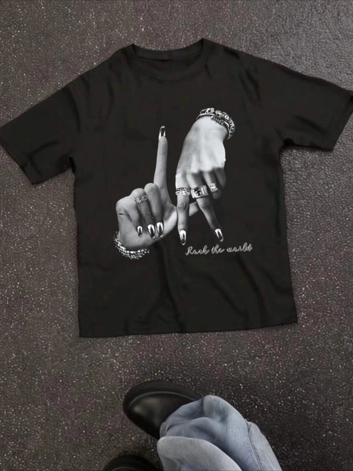 Women's Urban Style “Los Angeles Hand Gesture” T-Shirt – Graffiti Lettering and Jewelry Details, 100% Cotton