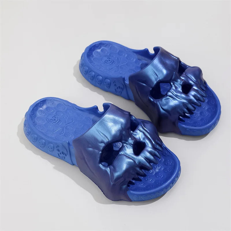 These sandals stand out for their robust shape and provocative style. The embossed skull motif, combined with a shiny metallic finish, gives them a cyberpunk-meets-urban feel. Perfect for those looking for more than just flip-flops: they are an expression of personality, rebellion, and originality.