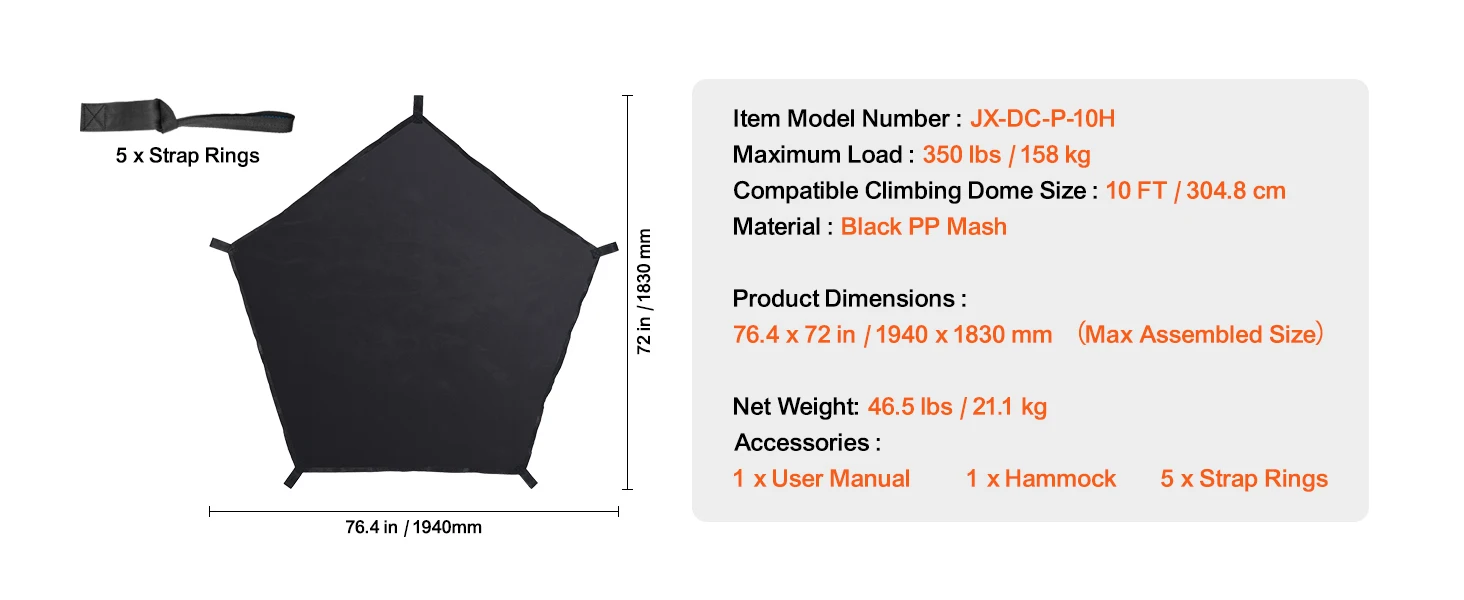 With a diameter of 10 ft (3 m), it is large enough for 4–5 children aged 3 to 10 to play safely together. The structure allows them to climb, swing, jump, and relax, keeping them entertained for hours while improving strength, balance, and social skills.