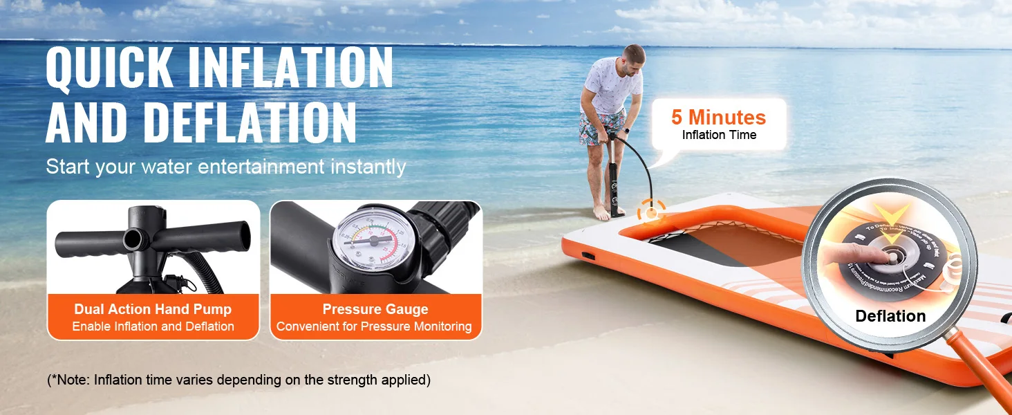 Includes a double-action hand pump with a pressure gauge, making inflation and deflation easy in just a few minutes.